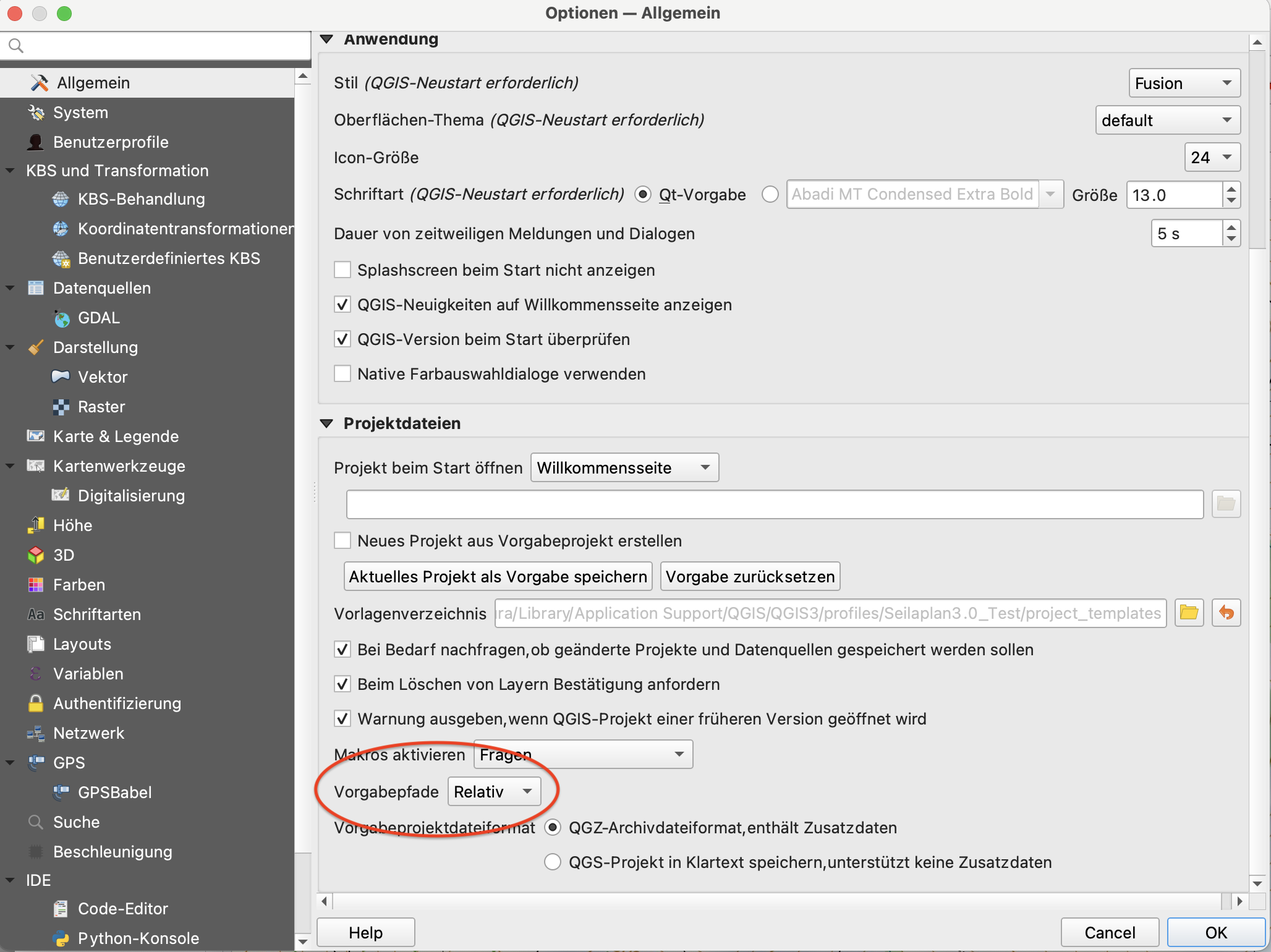 1.) Öffne die QGIS-Einstellungen unter Einstellungen > Optionen. Wähle im Reiter Allgemein ganz unten bei Vorgabepfade die Option «Relativ» (Abb.1) Dadurch speichert QGIS alle Layer-Dateipfade relativ zum QGIS-Projekt. Wenn du das QGIS-Projekt öffnest, werden alle Layer-Dateien, wie vor dem Verschieben, korrekt angezeigt.