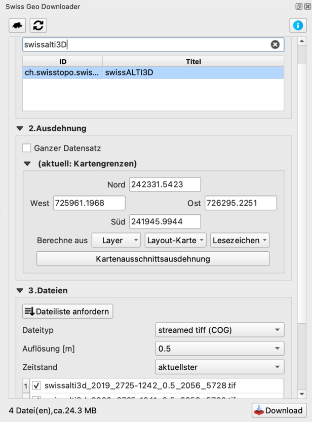 - SwissGeoDownloader öffnen und unter 1. Datensatz „swissALTI3D” suchen und auswählen.